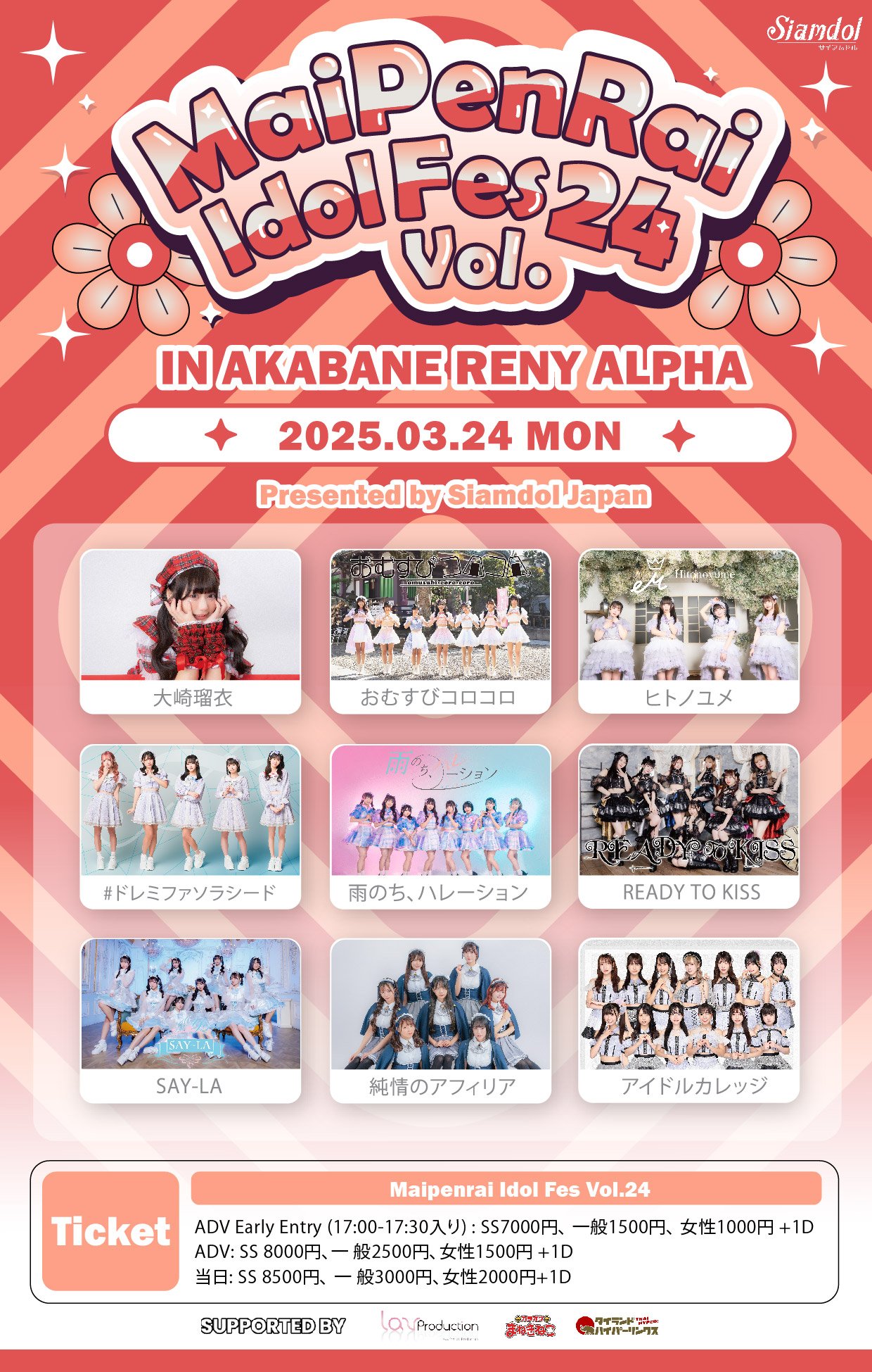 日本からタイに進出したサイアムドルによるアイドル対バンライブ「Maipenrai Idol Fes vol.24」が、東京・赤羽ReNY alphaで2025年3月24日(月)に開催されます。チケット販売は3月8日(土)20時から。https://t.livepocket.jp/e/maipenrai24