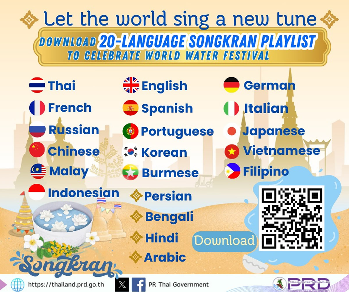 タイ文化振興局は2025年3月28日、水かけ祭りで知られるソンクラーン(タイ正月)ソングの新バージョンを20言語で発表しました。対象となる言語は、タイ語、日本語、韓国語、中国語、ベンガル語、ペルシャ語、ポルトガル語、フランス語、ビルマ語(ミャンマー語)、フィリピン語、マレー語、ドイツ語、ロシア語、ベトナム語、スペイン語、英語、アラビア語、イタリア語、インドネシア語、ヒンディー語です。