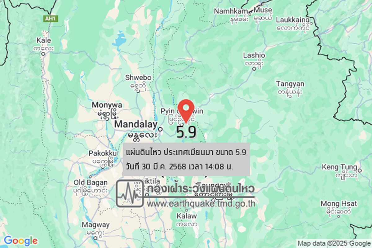 タイ時間の2025年3月30日14時08分06秒、ミャンマー中部地域を震源とするマグニチュード5.9の地震が発生しました。震源の深さは10km。メーホンソーン県パーンマパー郡から北西約332kmの地点が震源です。