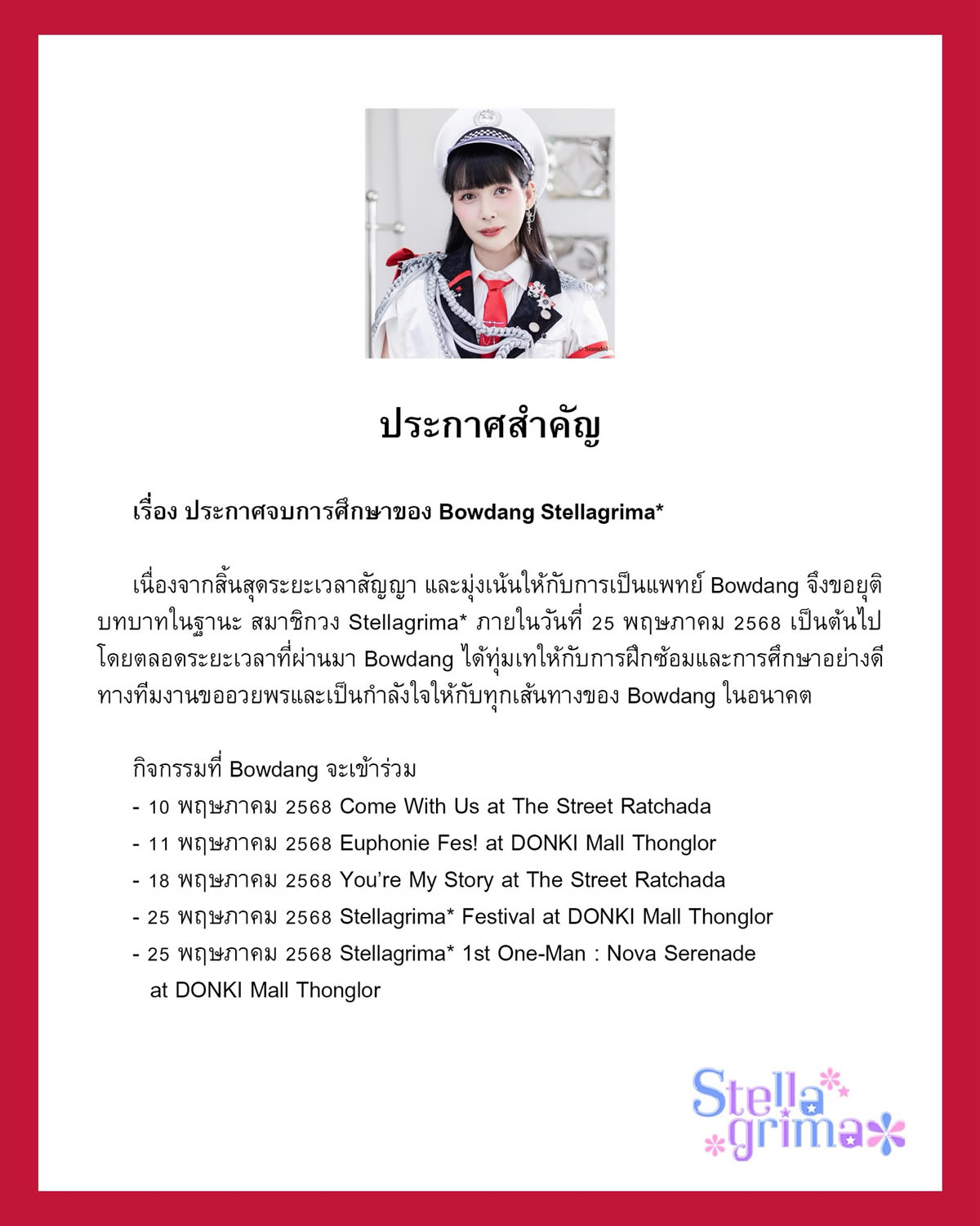 アイドルグループStellagrima*は2025年5月2日、ボーデーン(Bowdang)の卒業を発表しました。ボーデーンはこれまでアイドル活動を行いながら医療を学んでおり、先日はチュラロンコーン大学を卒業。今後は本格的に医療の道を進みます。