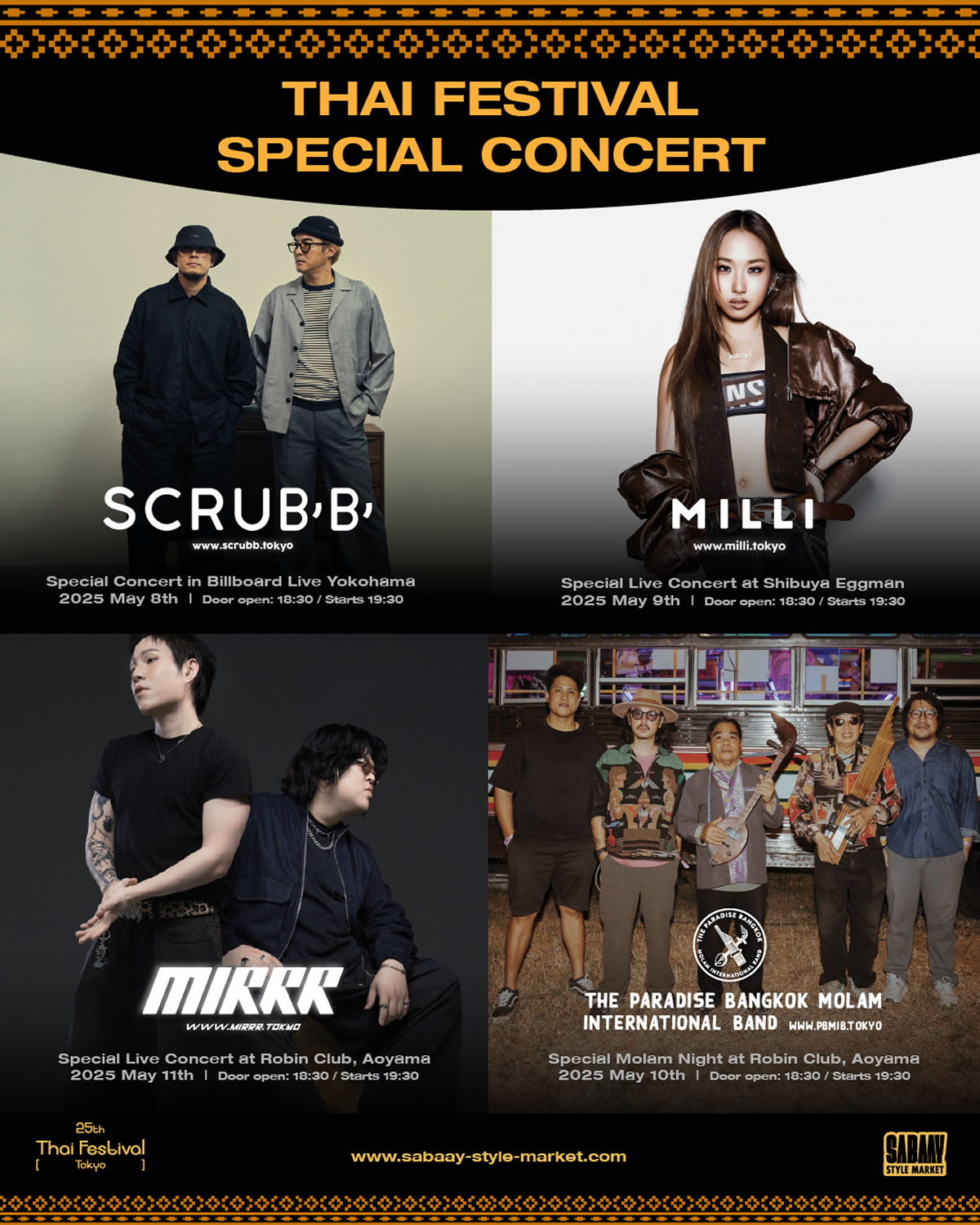 また、2025年の「タイフェスティバル東京」では、タイ音楽界を代表するアーティスト4組による単独ライブコンサートの開催が予定されています。いずれもタイ国内外で高い人気を持つアーティストで、日本の音楽ファンに向けた特別なステージが披露されます。