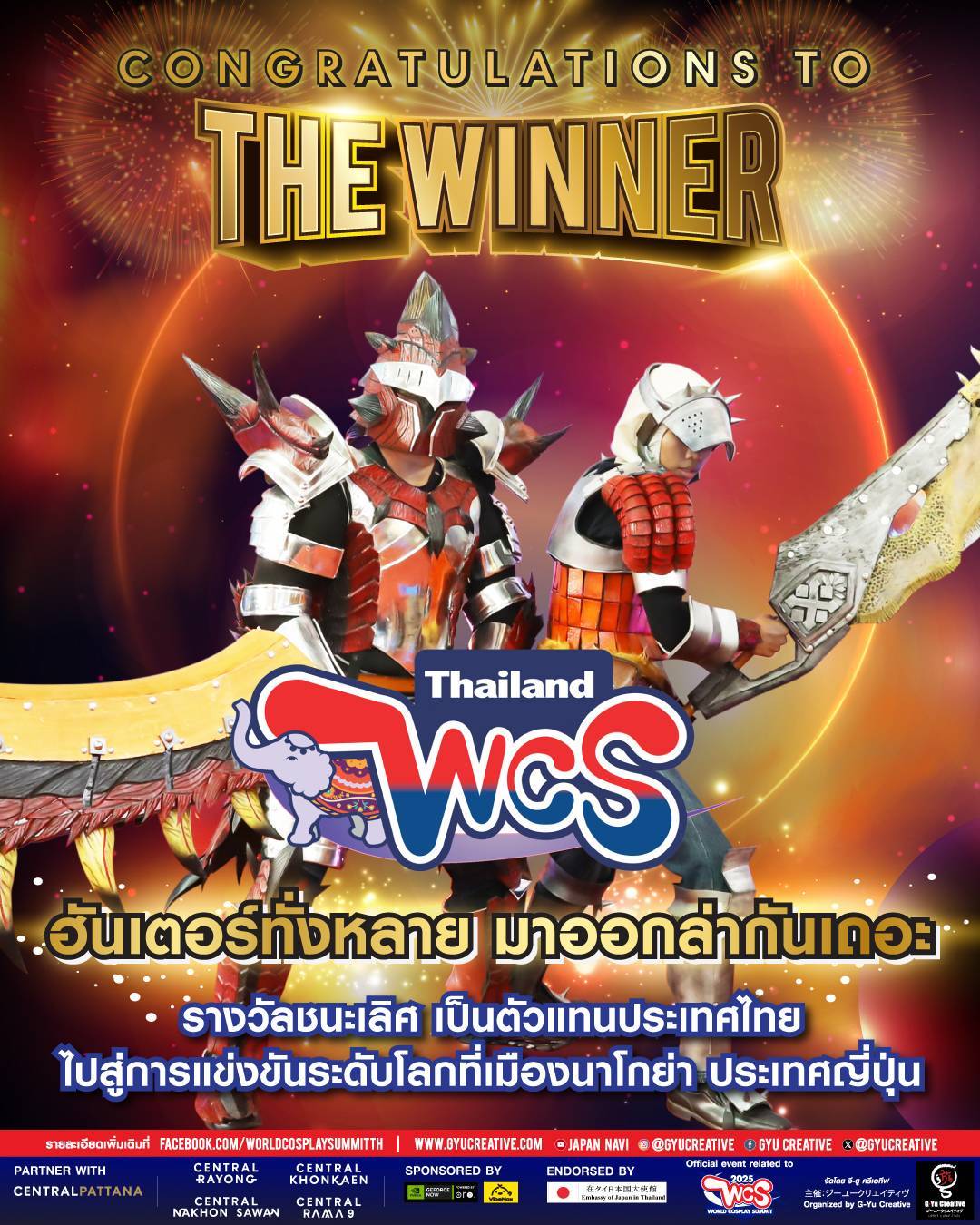 栄えある優勝に輝いたのは、“ฮันเตอร์ทั่งหลาย มาออกล่ากันเถอะ”(訳:ハンターたちよ、狩りに出よう)チームで、メンバーはทศพล มณฑาทิพย์さんとธนโชติ แก้วคำさん。人気ゲーム『Monster Hunter』シリーズを題材としたパフォーマンスで、衣装の精巧さと演技力が評価され、タイ代表として世界大会への出場権を獲得しました。副賞として、優勝盾および賞金20,000バーツが授与されました。