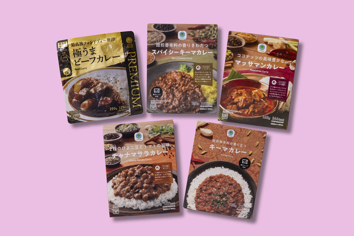 (肉の旨みとまろやか野菜 ビーフカレー甘口、肉の旨みとまろやか野菜ビーフカレー中辛、肉の旨みとまろやか野菜 ビーフカレー辛口、あさりの旨みとスパイスが効いたシーフードカレー、ごろごろ野菜とやわらかチキンコク旨スープカレー、焙煎香辛料の香りきわだつ スパイシーキーマカレー、ココナッツの風味豊かな マッサマンカレー、2種のひよこ豆とトマトの旨味 チャナマサラカレー、最高級フォンドヴォー使用 極うまビーフカレー、やわらかな牛肉の味わい欧風ビーフカレー、焙煎香辛料の香り立つ キーマカレー、爽やかな酸味とコク バターチキンカレー)