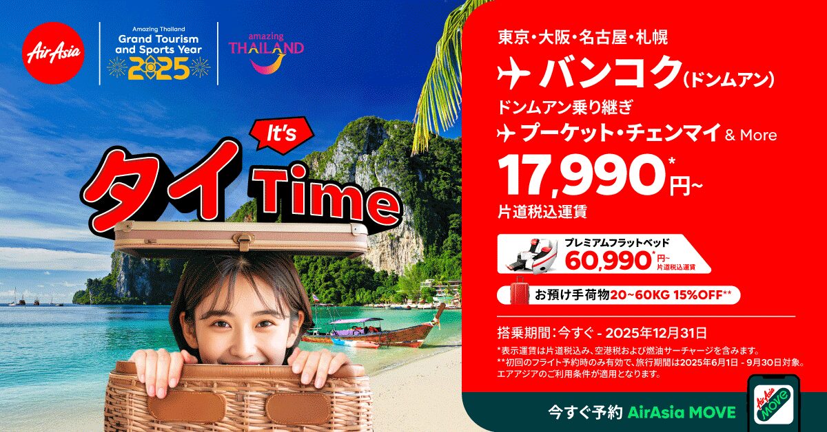 格安航空会社エアアジアが、タイ国政府観光庁とのコラボレーションによる「It’s タイ Time セール」を2025年5月26日より開始しました。東京・大阪・名古屋・札幌などからタイへの旅が、より身近でお得になります。