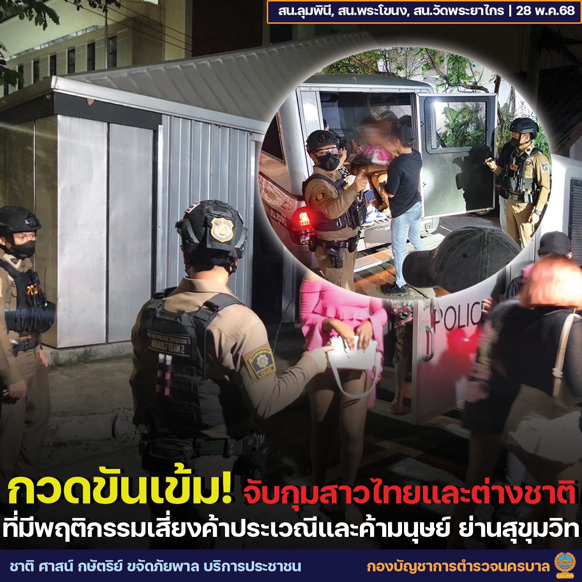 バンコク首都警察本部=は2025年5月27日午後10時30分頃、ルンピニ署の指揮のもと、スクンビット通りソイ4周辺(バンコク・クロントーイ区)で一斉取り締まりを実施し、売春行為や人身売買の疑いがある15人を検挙しました。