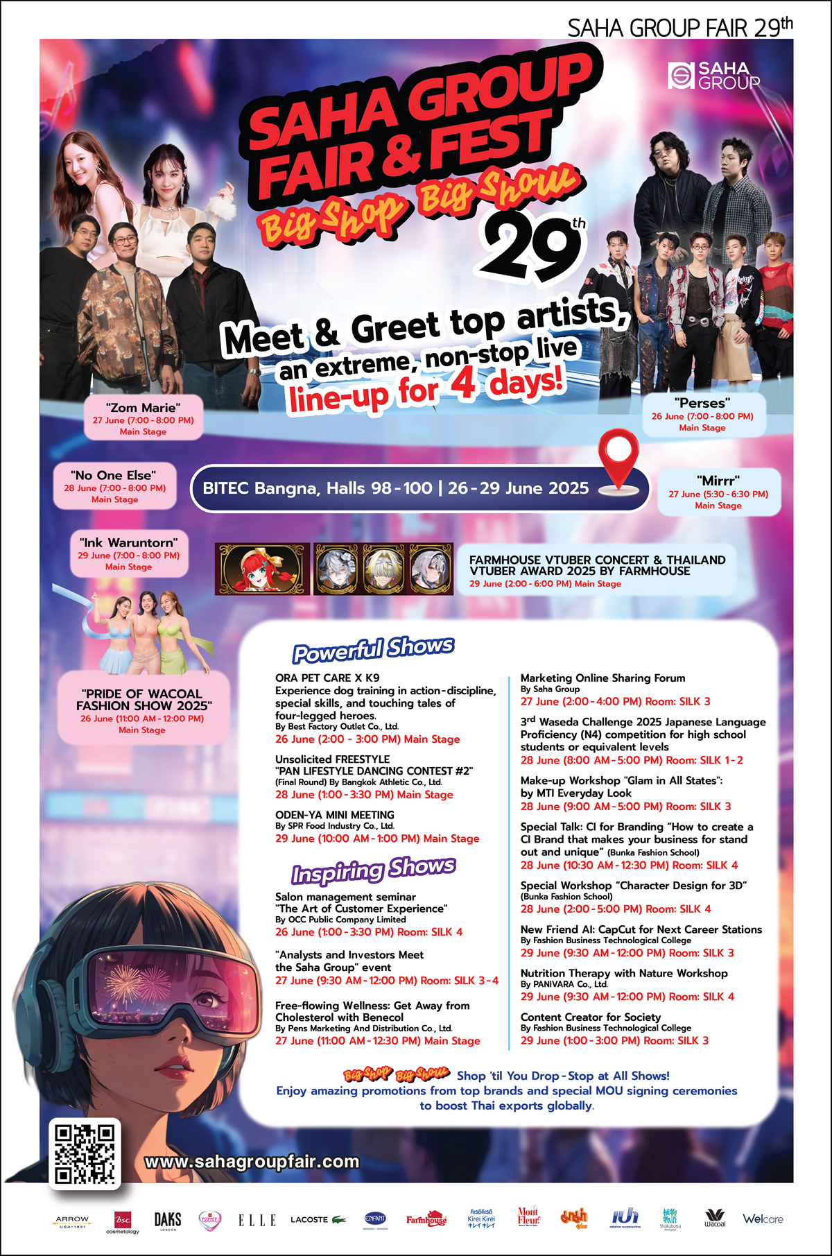 サハグループが主催する大型イベント「第29回サハグループフェア – Big Shop Big Show」が、2025年6月26日(木)から29日(日)まで、バンコク国際展示場(BITEC)にて開催されます。ショッピングの楽しさとライブエンターテインメント、さらにはデジタル技術の最前線が融合する、まったく新しい体験が来場者を待ち受けています。
