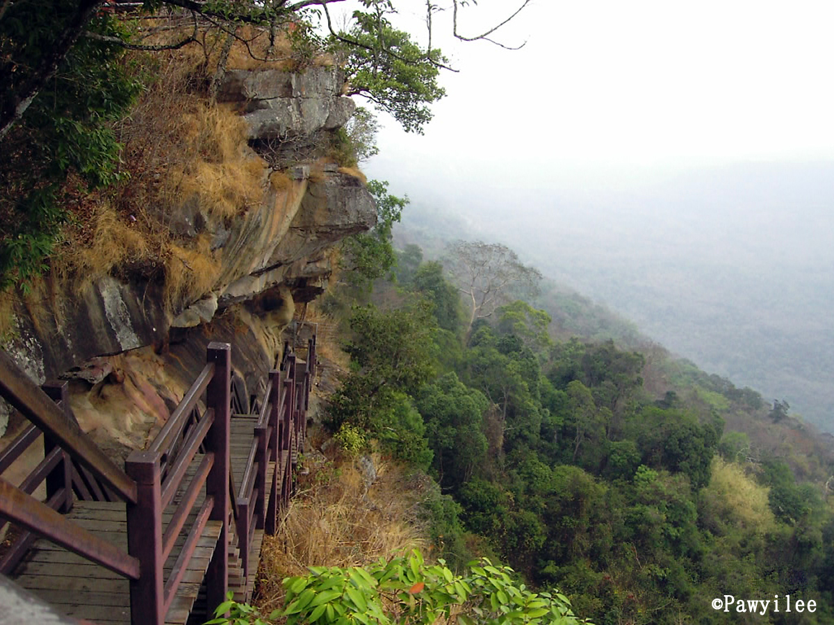 「パー・モーイデーン」は、タイ側から眼下にカンボジア領の広大な平原や森林を望める切り立った崖で、幅は約300メートルにおよびます。晴れた日には、真正面にそびえる山の上にある世界遺産・カオプラウィハーン遺跡(カンボジア領)の姿も遠望でき、荘厳な風景が広がります。