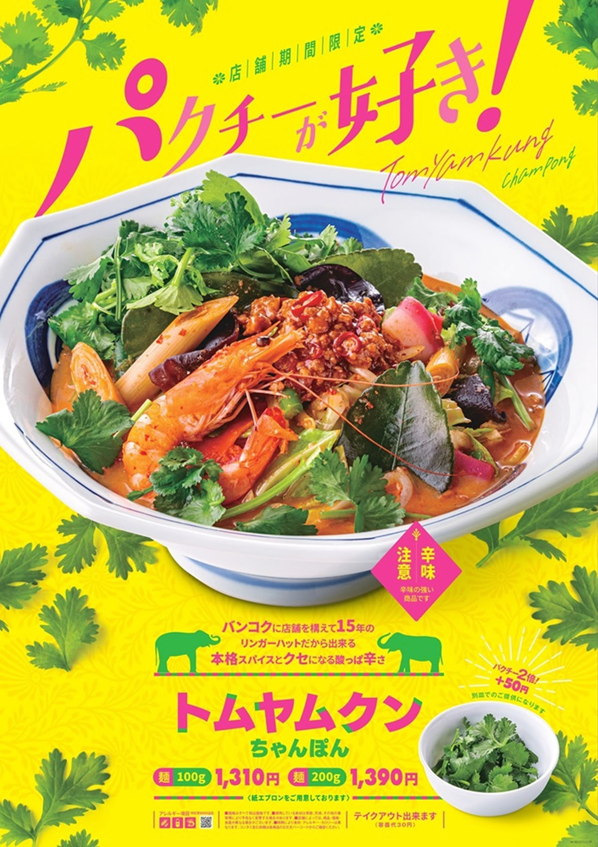 バンコクに15年間店舗を構えるリンガーハットが、自信を持って届ける「トムヤムクンちゃんぽん」は、有頭エビと国産パクチーを使用し、爽やかな辛味と酸味が特長の一品。唐辛子やにんにく、レモングラス、ライムリーフなど、タイ料理らしいスパイスが絶妙に効いたスープは、日本でも本格的なトムヤムクンの風味を楽しめると話題です。