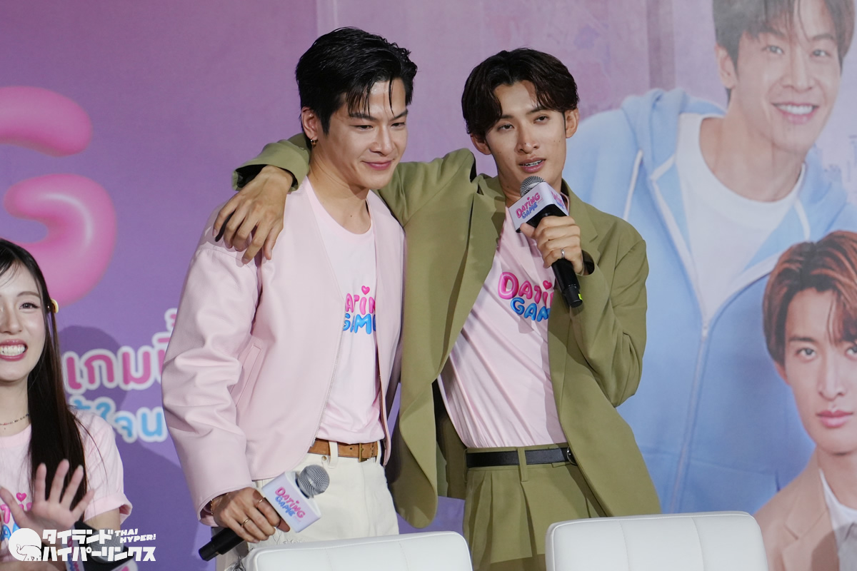 ポッピーからドラマに出演した感想を聞かれると、2人はクスクス笑いながらも「楽しい、楽しい、嬉しい、緊張してる」と回答。「オファーが来たときは緊張しました。やっぱりこういった大きなプロジェクトなのでうまくやっていけるかなと不安もありましたが、ワクワクの方が勝っていたので、愛されるシリーズになるように頑張りました」と話し、フルークは「同じです」とシンプルに答え、「今回こういった大きなプロジェクトで素晴らしい俳優さんたちと共演できる素晴らしいチャンスでした」と続けて、向井にバトンタッチ。