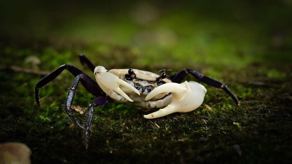 「プージャオファー」は「パンダクラブ」とも呼ばれ、白い甲羅とハサミ、そして紫黒色の歩脚という特徴的な姿を持ちます。野生での目撃例は極めて少なく、その希少性が知られています。