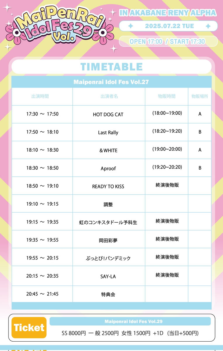 出演は、HOT DOG CAT、Last Rally、&WHITE、Aproof、READY TO KISS、虹のコンキスタドール 予科生 、岡田彩夢、ぶっとび!パンデミック、SAY-LA。