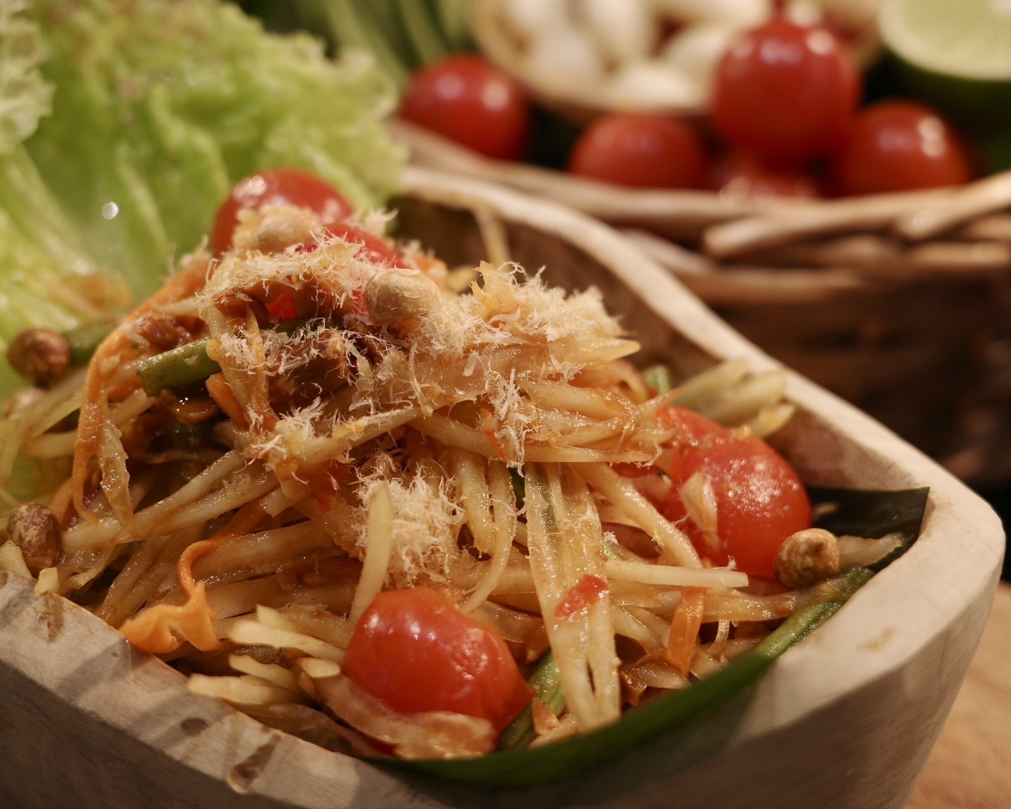 連日の猛暑で食欲が落ちがちなこの季節、体を内側からリフレッシュするスパイスの効いたタイ料理がビュッフェ台に並びます。刺激的な辛さとココナッツのコクが癖になる「レッドカレー」や、シャキシャキの青パパイヤに唐辛子やナンプラー、ライム汁にピーナッツを合わせ、ピリッと刺激的でありながら爽快な後味が魅力のタイを代表するサラダ「ソムタム」が登場。