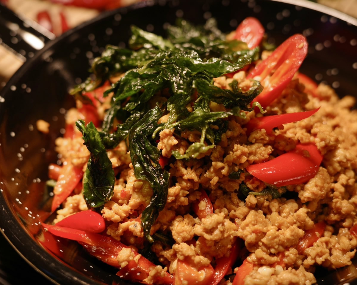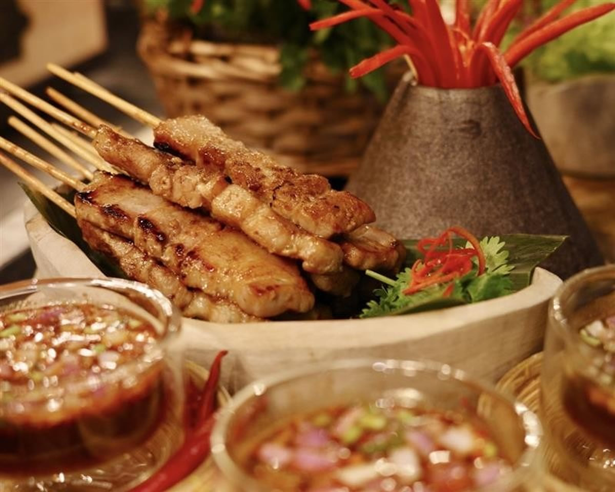たっぷりの唐辛子とフレッシュなバジルでチキンのひき肉を炒めた「ガパオ」や、お客様の目の前で焼き上げる「グリルポーク」には、マイルド・ミドル・スパイシーと辛さの違う3種類のディップソースを添えてご提供します。この機会に是非タイ本場の辛さに挑戦してください。