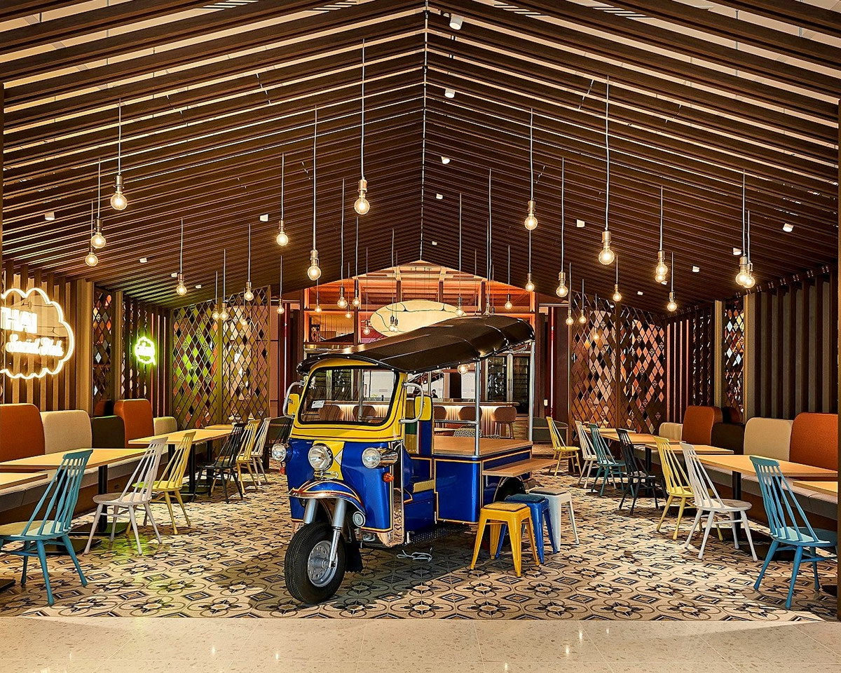 タイ料理レストラン「スアンブア」は、活気あるタイの屋台やマーケットをコンセプトとしています。入口にはタイを象徴するトゥクトゥクが飾られ、店内に一歩足を踏み入れるとタイらしい色鮮やかなインテリアやスパイスの香りが漂います。まるでタイ旅行に来たかのような雰囲気が漂う非日常の空間で、タイの“旨辛”を味わう特別なグルメ体験をお楽しみください。