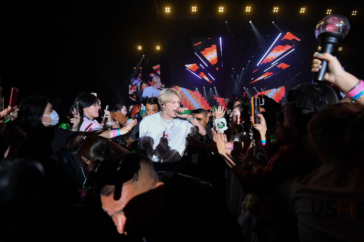 その後も「On Kiss」「Devotion」「Mine」と立て続けに披露。代表曲「ROCK STAR」ではステージの熱気が最高潮に達し、観客は総立ちでジャンプ。さらに「Good Morning Night」ではステージを降り、ファンの間を歩いてパフォーマンスするという演出も。会場は歓声に包まれました。