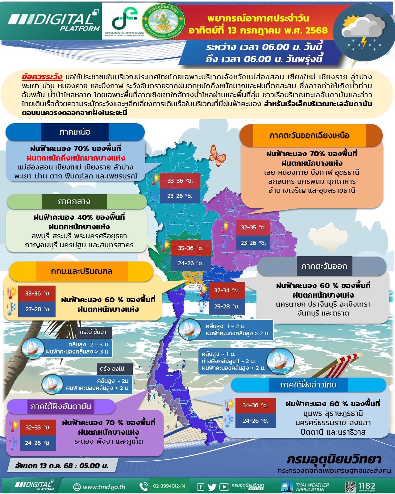 タイ気象局によると、2025年7月13日(日)は、モンスーン・トラフが北部・ラオス・ベトナム上部を通過し、低気圧が北部を覆っています。また、やや強い南西モンスーンがアンダマン海からタイ湾にかけて広がっており、タイ全土に湿った空気をもたらしています。