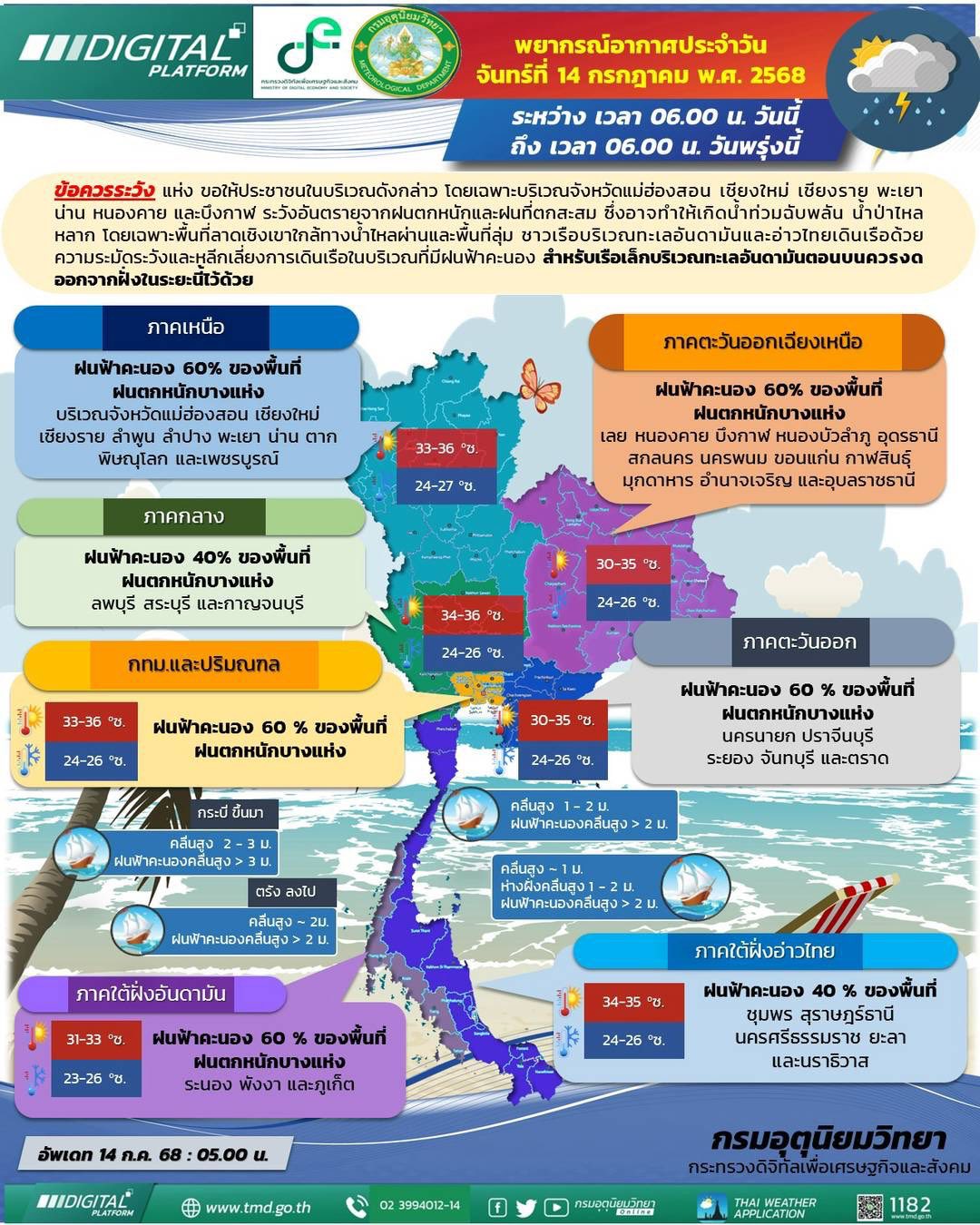 タイ気象局によると、2025年7月14日(月)は、モンスーントラフがミャンマー上部からタイ北部、ラオス北部、そしてベトナム北部にかけて停滞し、ベトナム北部には低気圧が発生。一方で、アンダマン海からタイ湾にかけてはやや強い南西モンスーンが流れ込んでいます。