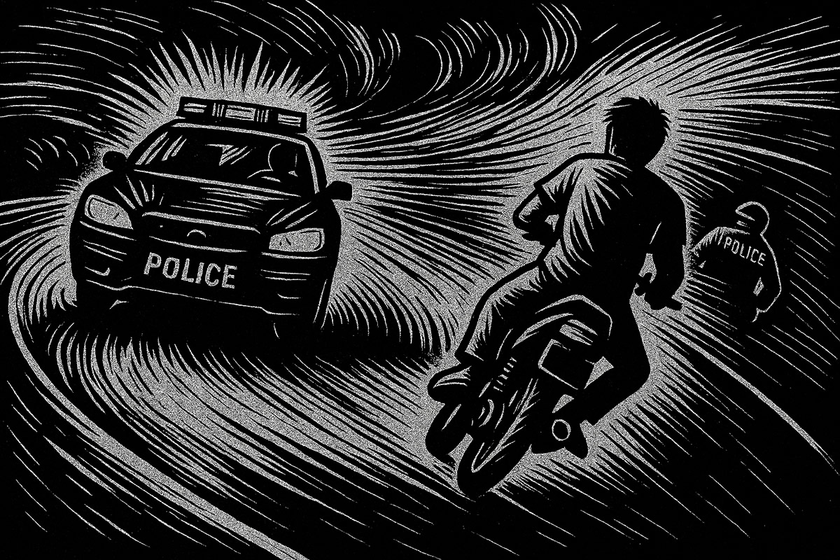 追跡はただちに始まり、サイレンが響く。前方に逃げるバイク、迫るパトカー。それは逮捕劇だったのか、あるいは儀式だったのか。果たして、その真偽を見極められるのは、天のみだったかもしれない。逃走の末に男は取り押さえられ、問いかけが飛ぶ。「使用したのか」──彼は頷いたかもしれない。そして「さっき、キメたばかり」と続けたかもしれない。