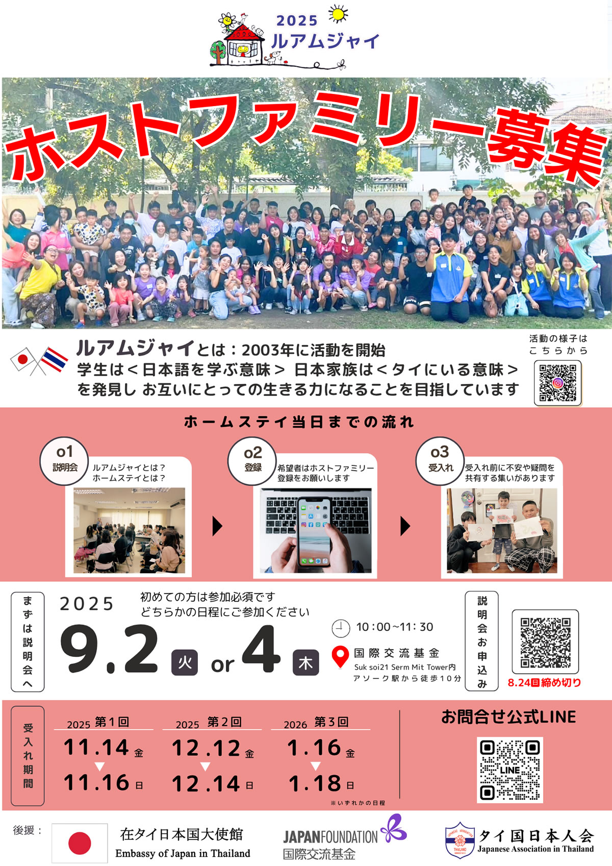 タイ国内日本人家庭ホームステイプログラム「ルアムジャイ」は、タイの地方で日本語を学ぶ高校生を受け入れる、バンコクの日本人ホストファミリーを募集しています。
