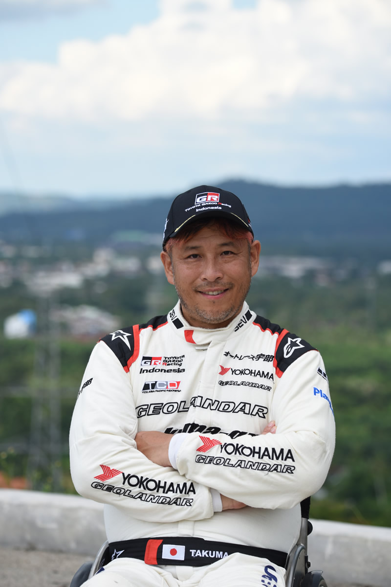 1974年生まれ。元ロードレース世界選手権(WGP)500ccクラスライダーとして活躍し、1997年には年間ランキング5位を獲得。1998年、練習中の事故で脊髄を損傷し車椅子生活となるも、四輪モータースポーツへと転向。以後、アジアクロスカントリーラリーやダカールラリーなど過酷な国際ラリーに挑戦し続けている。現在はチーム「takuma-gp」を率い、技術開発支援のもと、競技と並行して福祉支援・講演活動も展開。障がいを乗り越え挑戦を続ける姿勢は多くの支持を集めており、モータースポーツを通じた社会貢献活動にも力を注いでいる。