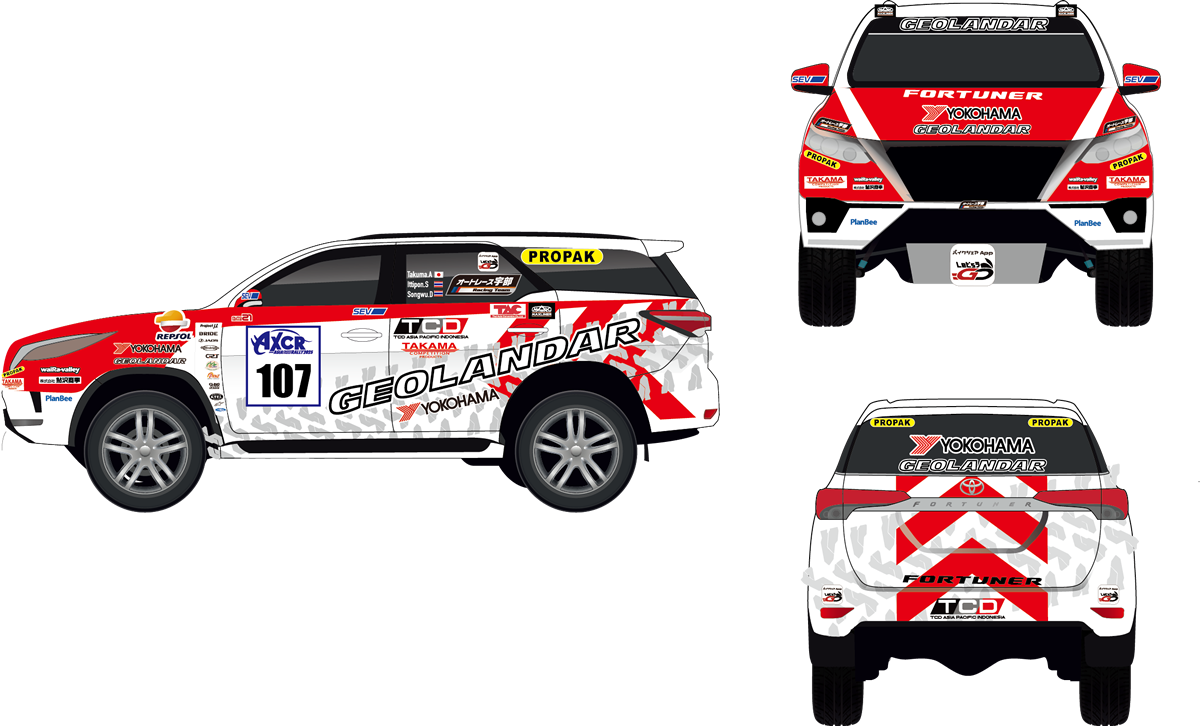 ラリーには、インドネシアのTCDアジア・パシフィックの技術協力を受けたトヨタ・フォーチュナーを投入。無改造の市販車で争われるT-2Dクラスにおいて、確かな信頼性と走破力を武器に、再び総合優勝を狙います。