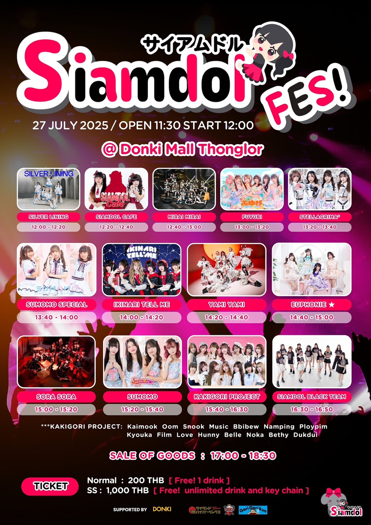 タイのアイドルプロダクション Siamdol(サイアムドル)による対バンライブイベント「Siamdol Festival(サイアムドル・フェスティバル)」が、バンコクのドンキホール(ドンキモール・トンロー4階)で、2025年7月27日(日)に開催されます。
