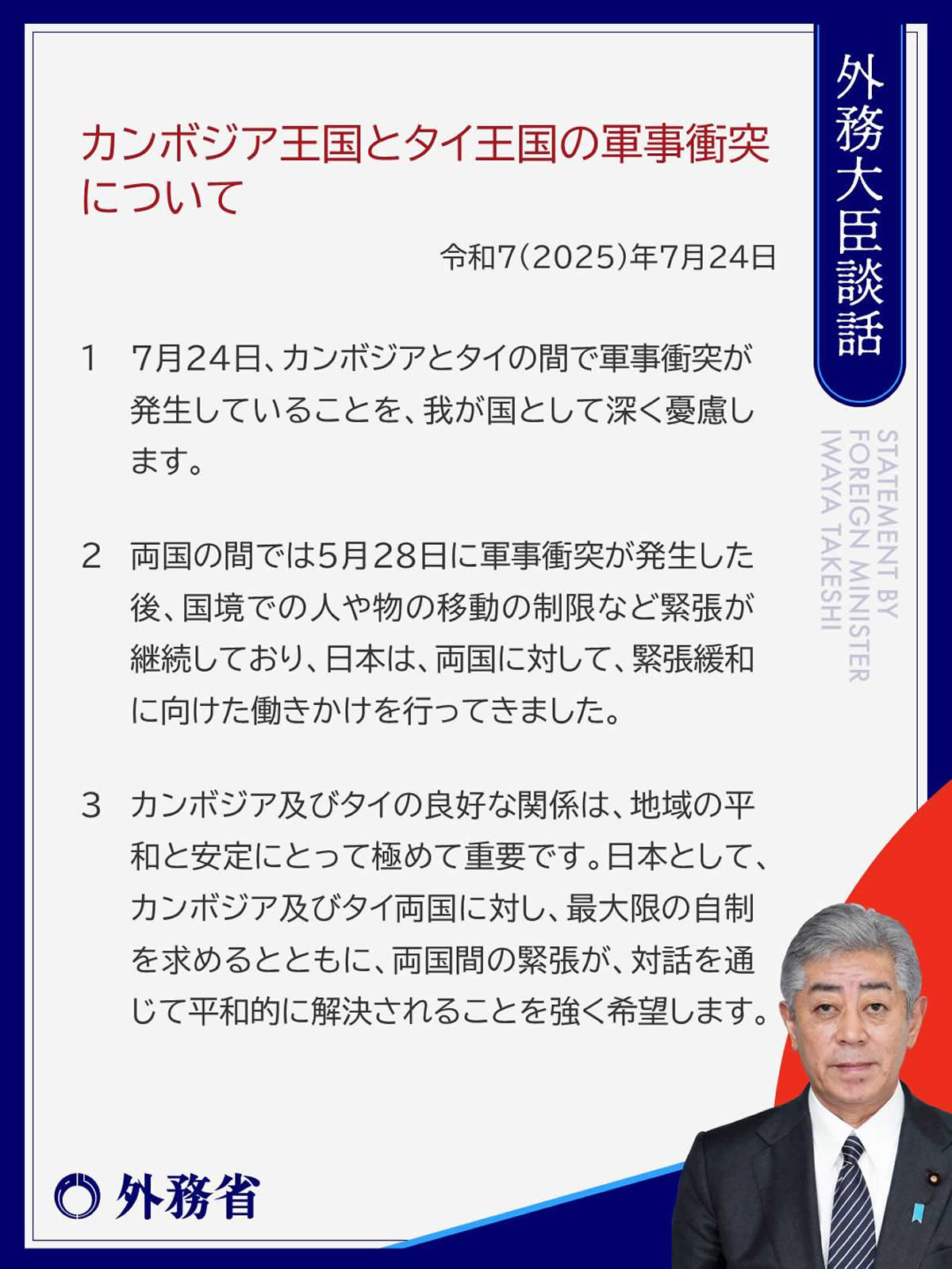 ■カンボジア王国とタイ王国の軍事衝突について(外務大臣談話)|外務省