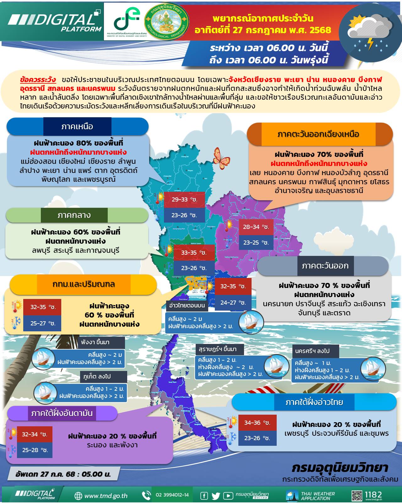 2025年7月27日(日)、タイ気象局は、アンダマン海・タイ本土・タイ湾に中程度の南西モンスーンが吹いていること、またベトナム北部沿岸とトンキン湾に低気圧が居座っている影響で、北部・東北部を中心に局地的な激しい雨が予想されると発表しました。特に東北部では非常に激しい雨となるところもあり、山沿いや低地、水路周辺では鉄砲水や冠水に警戒が必要です。