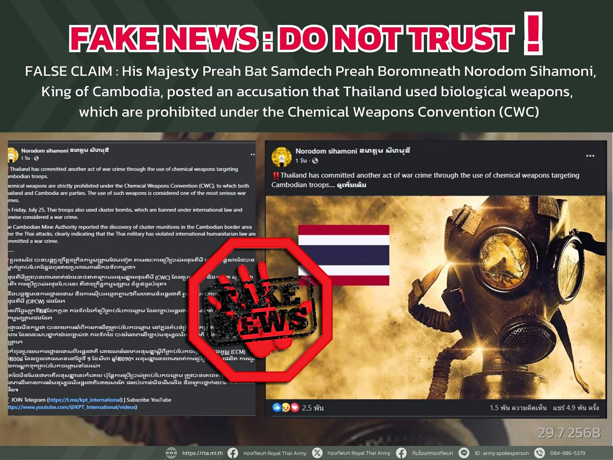 タイ政府は2025年7月29日、カンボジアとの国境衝突において「生物兵器を使用した」とする主張を全面的に否定しました。この主張は、カンボジア国王を装った偽のフェイスブックページに投稿されたもので、政府は「悪意ある偽情報であり、地域の緊張を煽る目的がある」と非難しています。タイ政府メディアNNTが伝えています。
