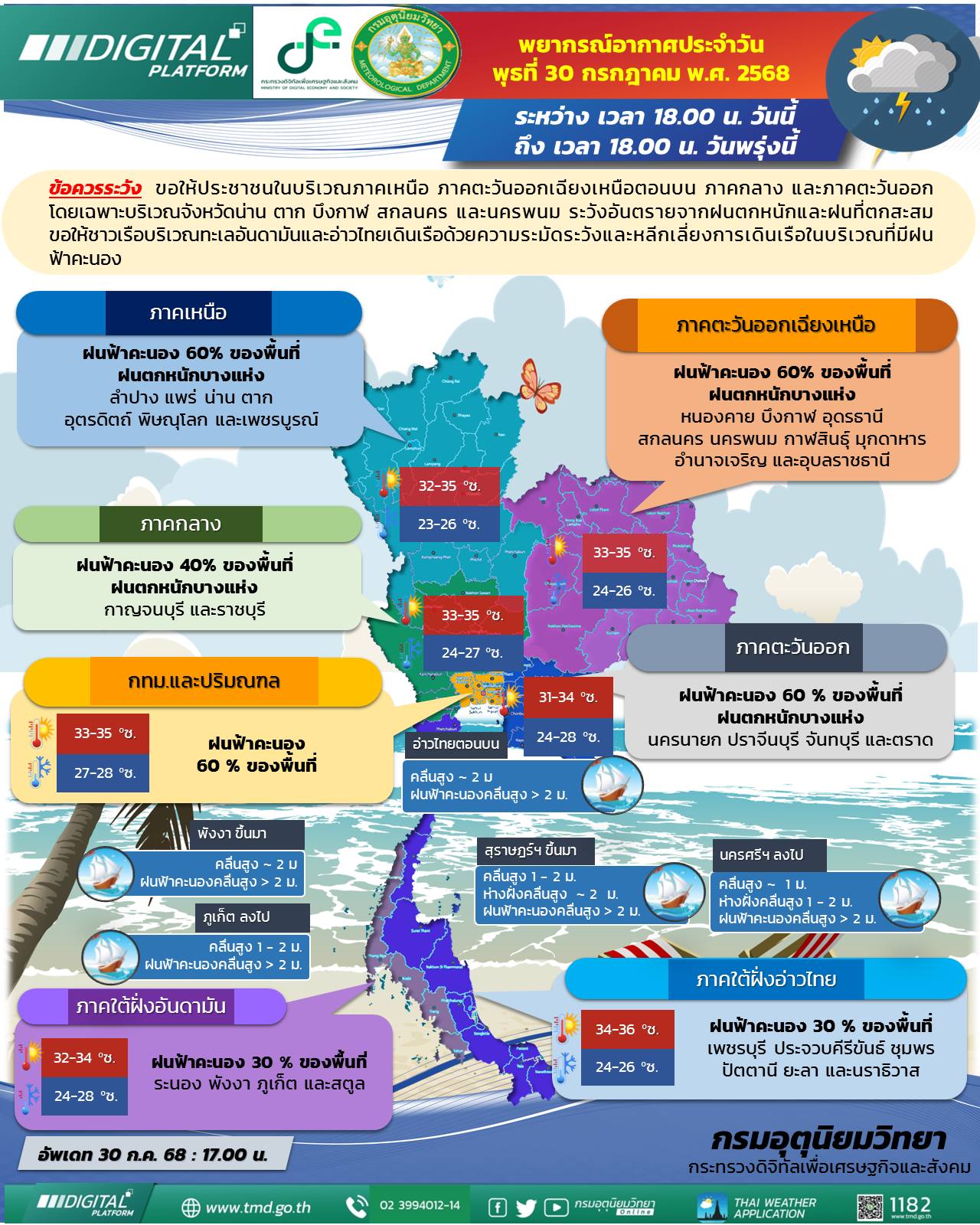 また、アンダマン海およびタイ湾の波も幾分穏やかになりますが、雷雨時には依然として2メートルを超える波が予想されており、小型船の運航には引き続き注意が求められます。