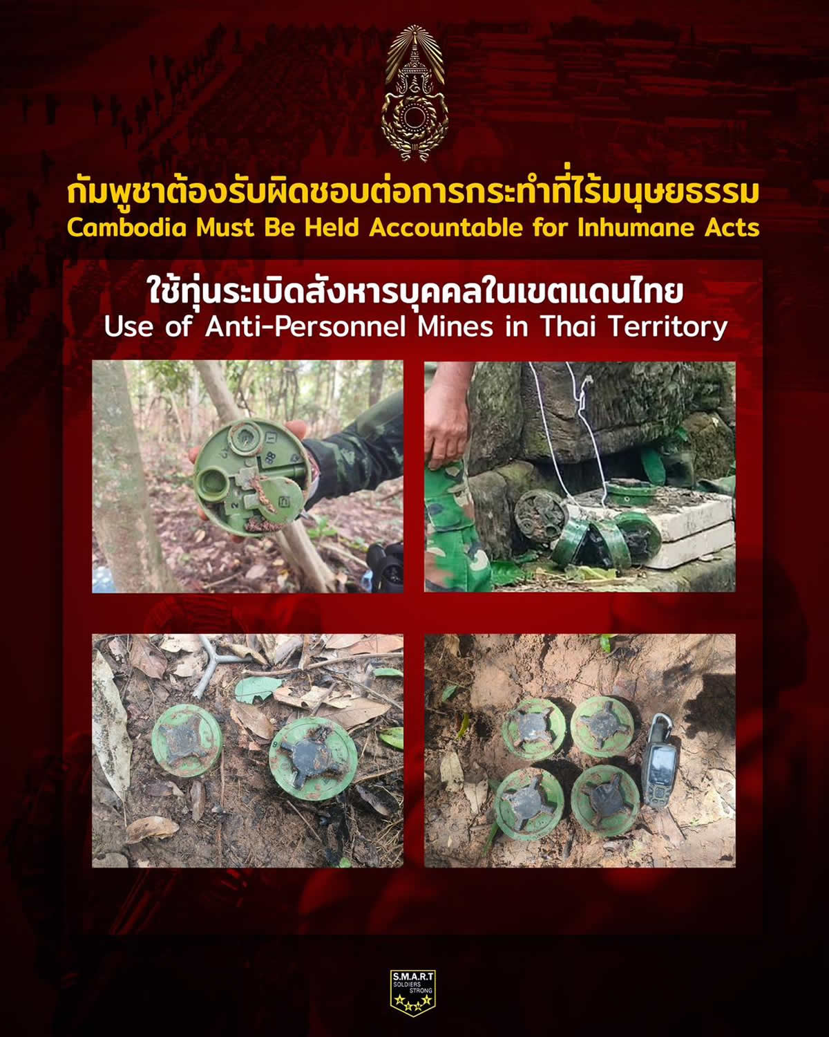 タイ陸軍第2軍管区司令部(本部:ナコンラチャシマー県スラナリー兵営)は2025年8月1日、公式Facebookを通じて、カンボジアによるとされる「8つの非人道的行為」を列挙し、国際社会に対して行動を呼びかける声明を発表しました。