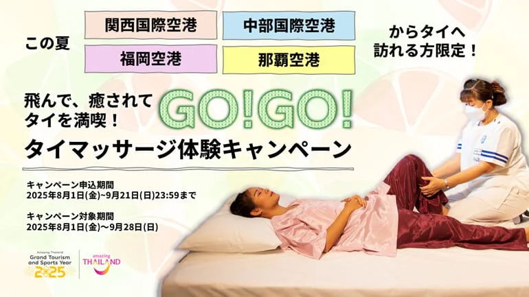 タイ国政府観光庁は2025年8月1日より、関西国際空港・中部国際空港(セントレア)・福岡空港・那覇空港からタイ・バンコクに渡航する旅行者を対象に、「GO!GO!タイマッサージ体験キャンペーン」を実施しています。