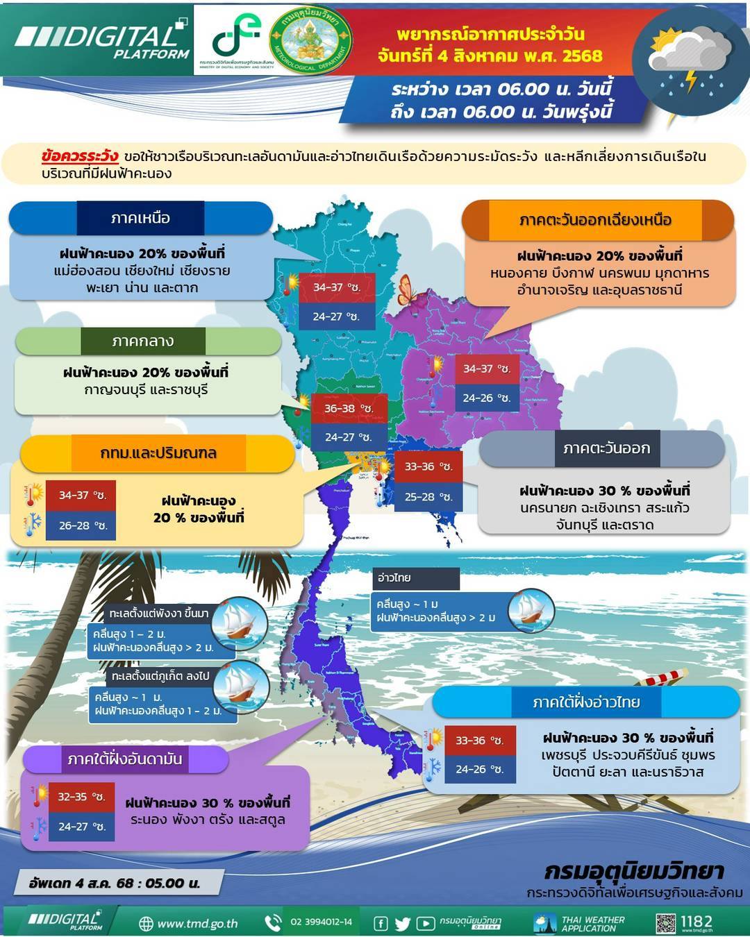 2025年8月4日(月)、現在、アンダマン海・タイ本土・タイ湾では弱い南西モンスーンが流れ込み、ベトナム北部には低気圧が停滞しています。タイ国内では晴れる時間が長くなるものの、北部・東北部・南部を中心に、午後は一時的なにわか雨や雷雨の可能性があります。