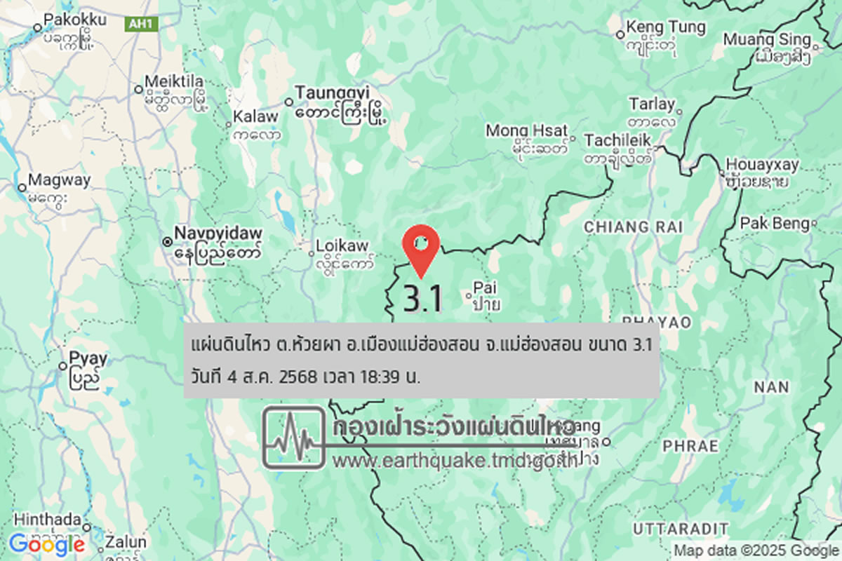2025年8月4日午後6時39分ごろ、タイ北部メーホンソーン県ムアンメーホンソーン郡フアイパー地区で、マグニチュード3.1の地震が発生しました。震源の深さは2km。この地震により、一部住民は揺れを感じ、2階建ての木造住宅などで床が揺れるなどの影響が報告されていますが、建物等への被害は確認されていません。