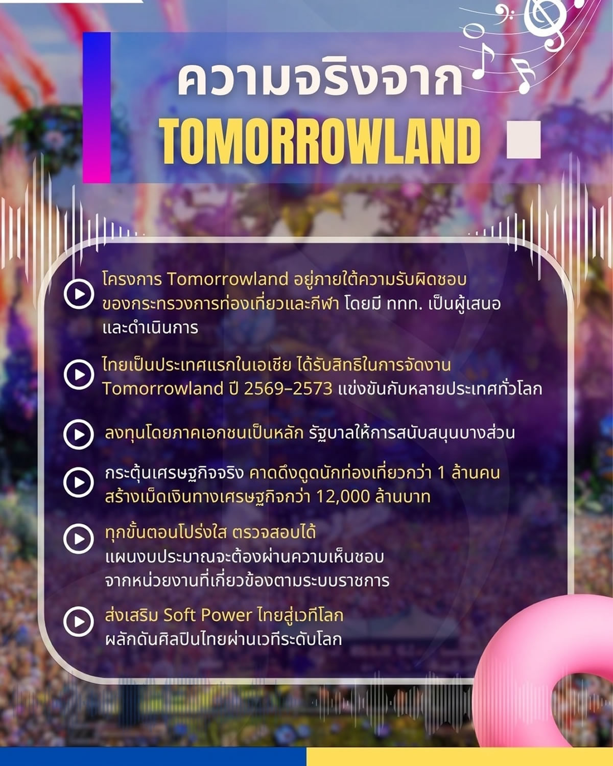 タイ観光スポーツ省は2025年8月5日、世界的に有名な音楽フェスティバル「トゥモローランド(Tomorrowland)」の開催権をアジアで初めて獲得したと発表しました。2026年から2030年までの5年間にわたり開催される予定で、国内外から100万人以上の観光客を呼び込み、120億バーツ(約480億円)を超える経済効果を生み出すことを期待しています。