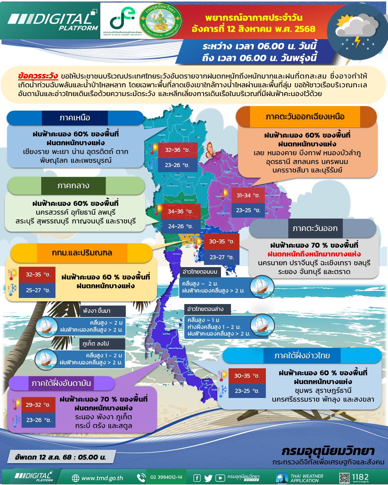 タイ気象局によると2025年8月12日、モンスーントラフが北部からラオス北部を通過し、ベトナム北部にかかる低気圧とつながっています。南西モンスーンもアンダマン海、タイ全土、タイ湾にかけて吹き込み、全国的に雷を伴う雨が予想され、一部地域では局地的に非常に激しい雨となる見込みです。山沿いや低地、水路周辺では土砂災害や急な増水、河川の氾濫に厳重な警戒が必要です。