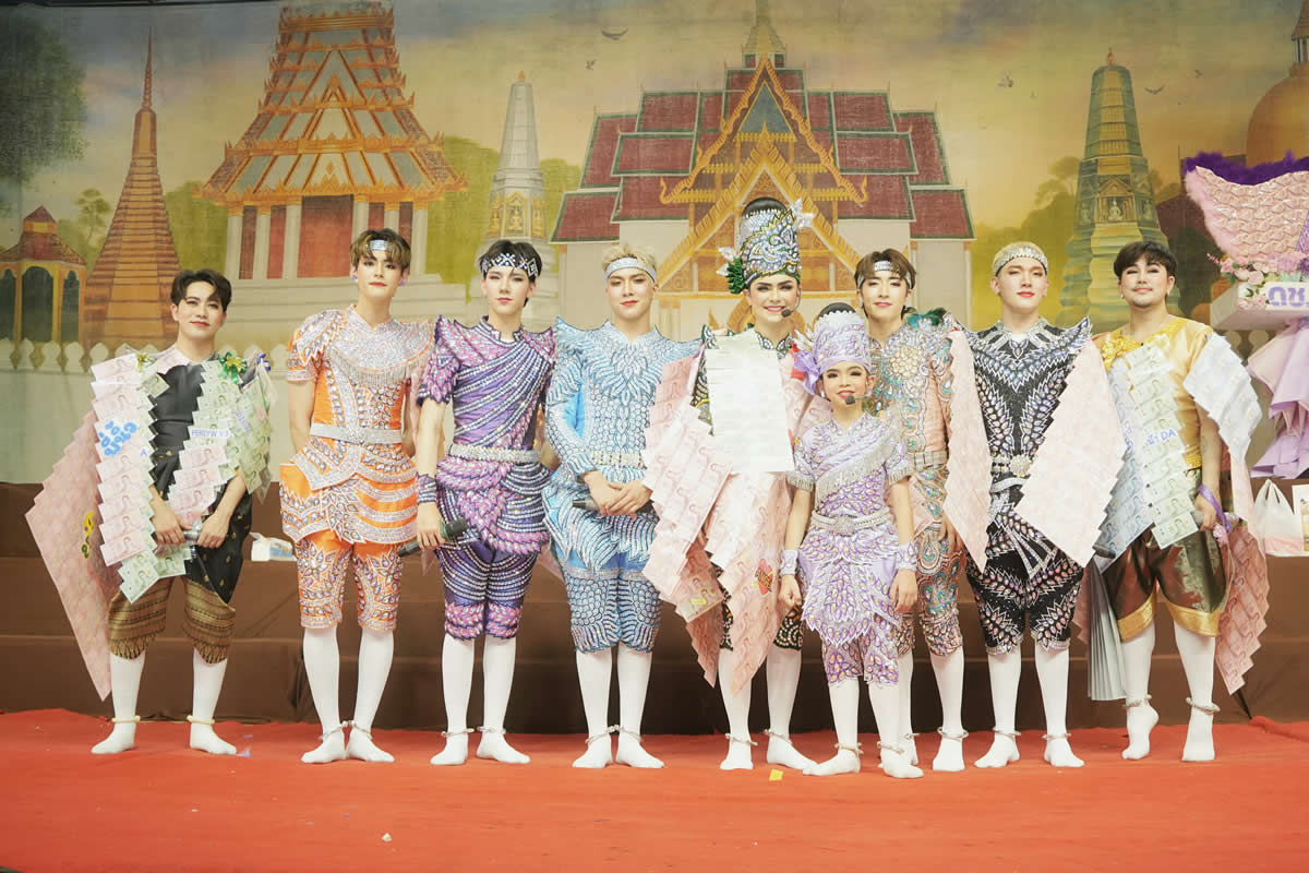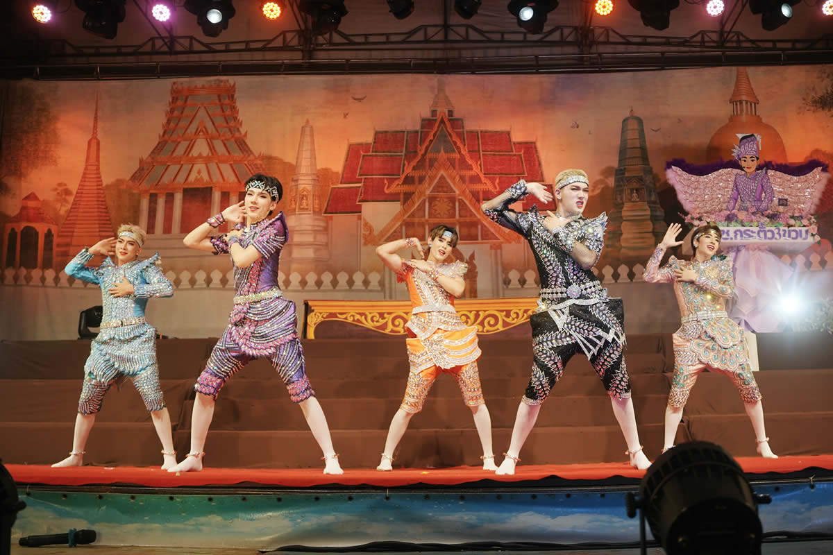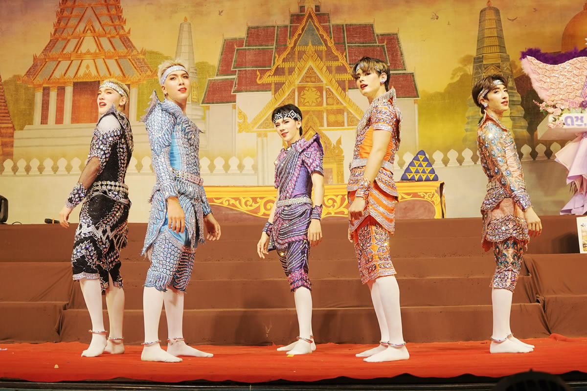 幕が上がると、まず「ソラーム・ナムペット」が伝統のリケー調で朗々と歌い上げ、拍手と歓声を浴びます。その後、スペシャルゲストとして登場したのがPERSES。メンバーのJung(ジャン)、Nay(ネー)、Krittin(クリティン)、Palm(パーム)、Pluggy(プラッギー)が、煌びやかなリケー衣装に身を包み、代表曲「ห้ามขยับจับนะ(FREEZE)」を披露しました。伝統の化粧や髪型もソラーム本人とチームが担当し、古典芸能と最新アイドルが融合した圧巻のステージに観客の歓声は最高潮に。