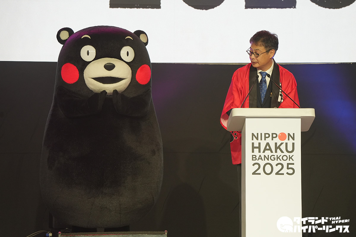 その後、株式会社ジェイデュケーション代表取締役でありバンコク日本博実行委員会代表を務める長谷川卓生氏、バンコクのチャッチャート・シッティパン都知事、大鷹正人駐タイ日本国大使、くまモンらが登壇し、開幕を祝う挨拶を実施。