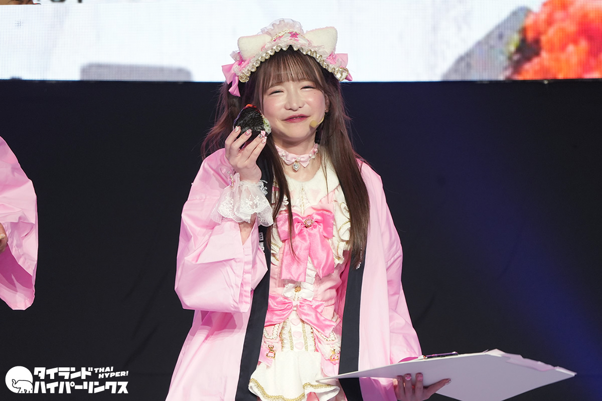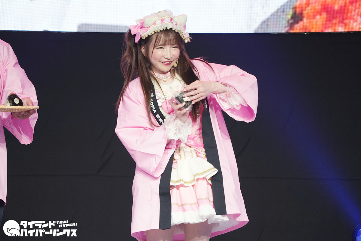 「バンコク日本博2025」の会場となったのは、クリーンシリキットナショナルコンベンションセンター。特設されたメインステージでもえのあずきは、侍と「あおさ」で知られる相馬市を紹介。さらに相馬市産のお米とあおさを使ったおにぎりをその場で味わい、来場者に美味しさをアピールしました。