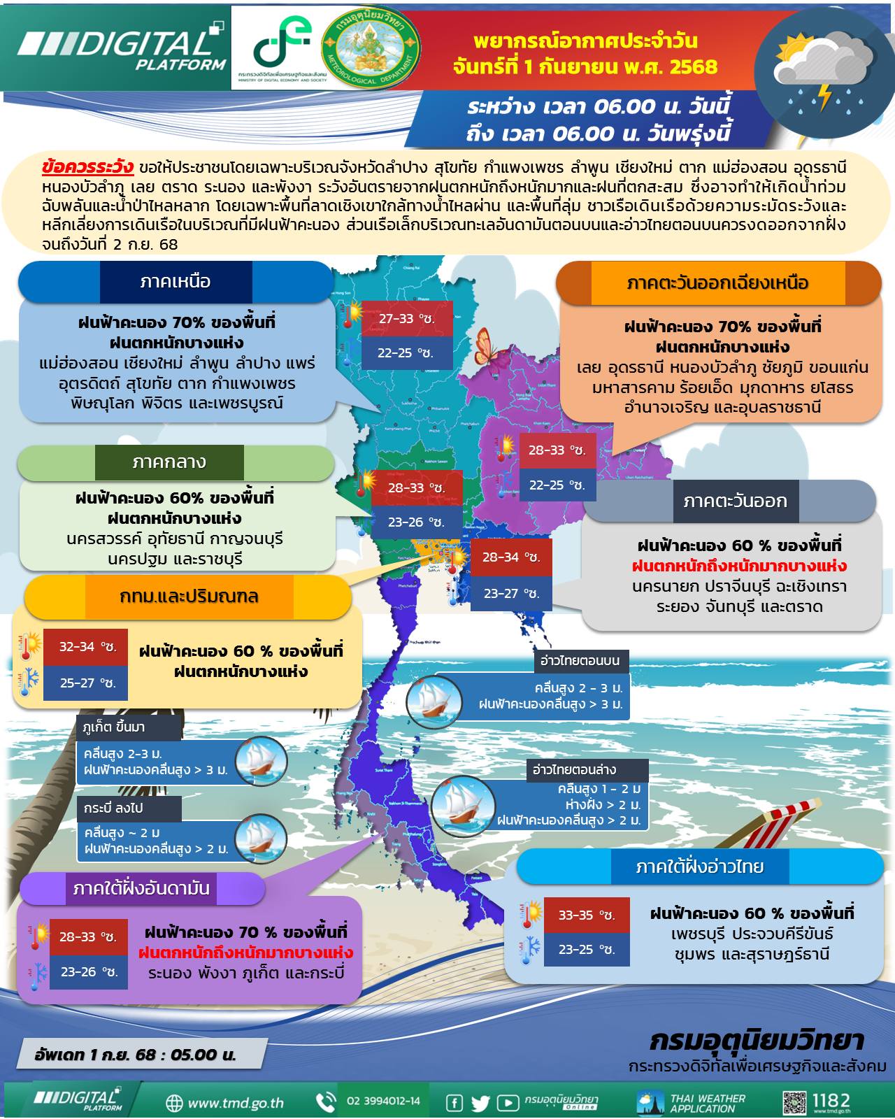タイ気象局によると、2025年9月1日(月)は、モンスーントラフが北部および東北部を通過し、アンダマン海からタイ全土、タイ湾にかけて南西モンスーンがやや強く吹いています。全国的に所により雷を伴う雨が予想され、とくに東部および南部西岸では局地的に非常に激しい雨となる見込みです。山沿いや低地、水路周辺では土砂災害や河川の氾濫に十分な注意が必要です。