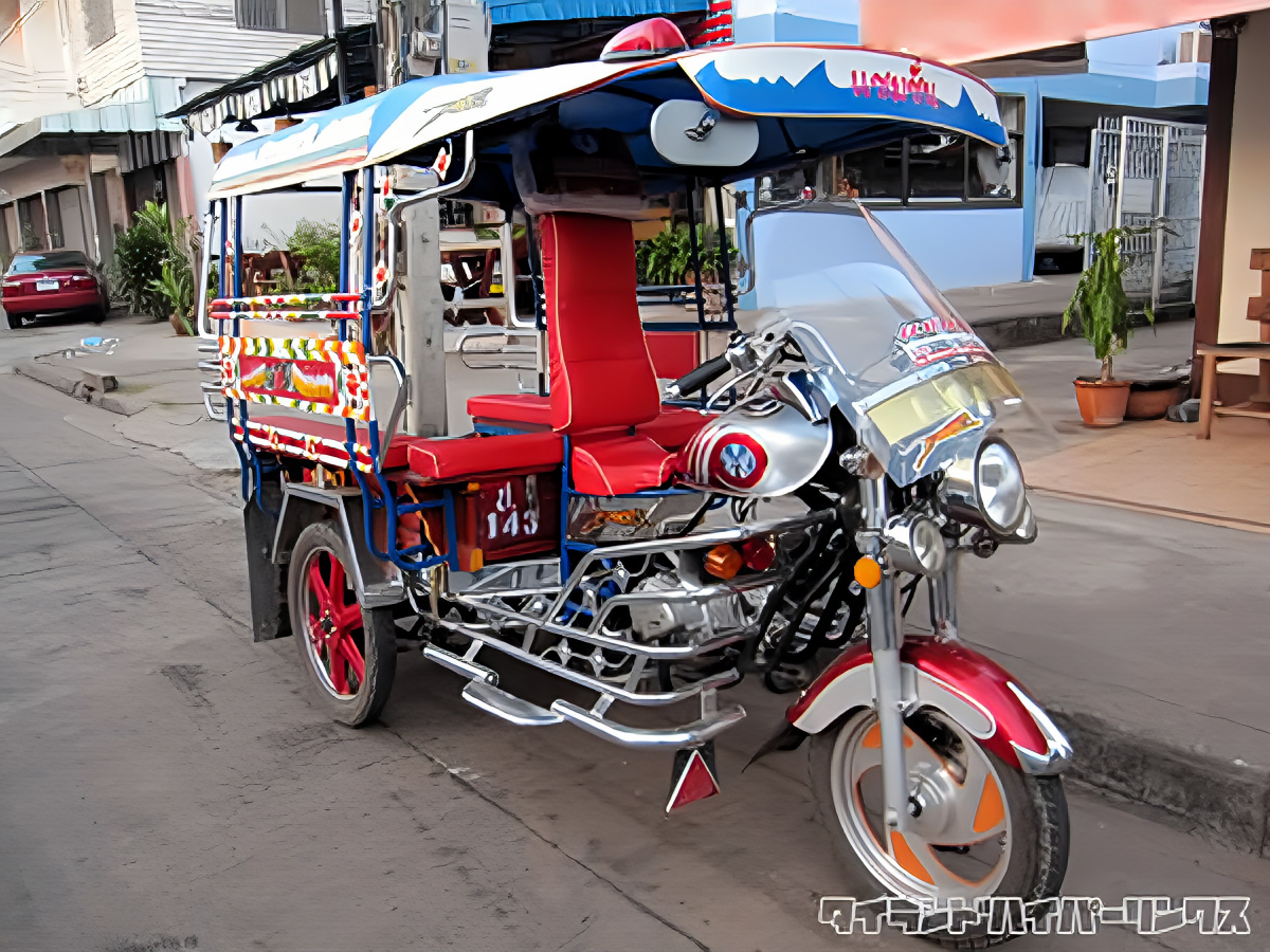 スカイラブとは、タイ東北部でタクシーとしても広く利用される三輪オートバイで、オートバイに屋根付きの客席を取り付けた庶民的な乗り物です。バンコクの「トゥクトゥク」と似ていますが、地域ならではの形状を持ち、日常の移動手段として親しまれています。