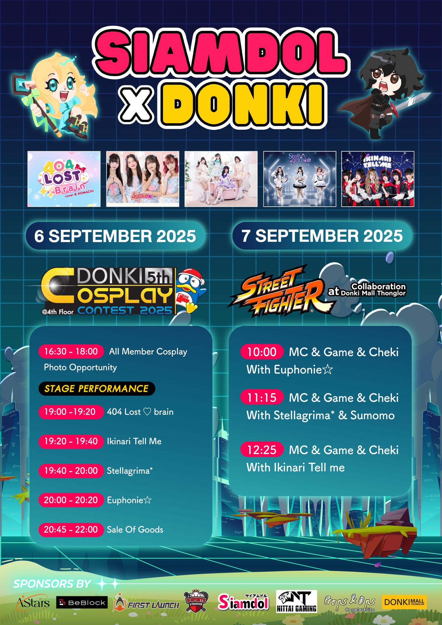 Siamdolの全グループ(SumomoはNamfah と Puifaii)が登場し、コスプレ姿で会場を彩ります。さらに、Nao・Sora・Liewの3人による特別ユニット 404 Lost ♡ brain(B-Komachiカバー)も出演。ステージライブの後には、コスプレ姿でのチェキ会も予定されています。
