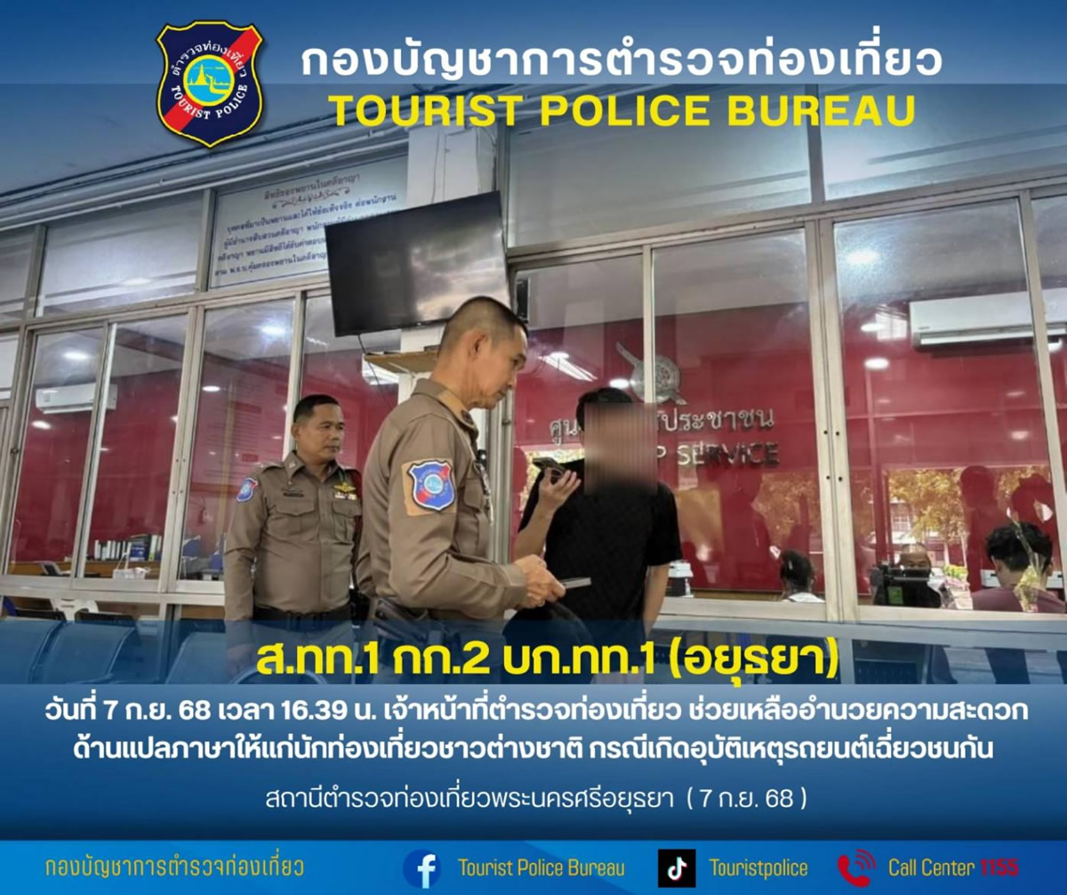 2025年9月7日午後4時39分頃、アユタヤ県パーククラン地区で自動車同士の接触事故が発生しました。運転しいた外国人が対応に困っていたため、観光警察が現場に駆けつけ、通訳や手続きの支援を行い、事故処理がスムーズに進められました。観光警察は外国人旅行者に寄り添った対応を続けており、安心して旅ができる環境づくりに努めているとしています。