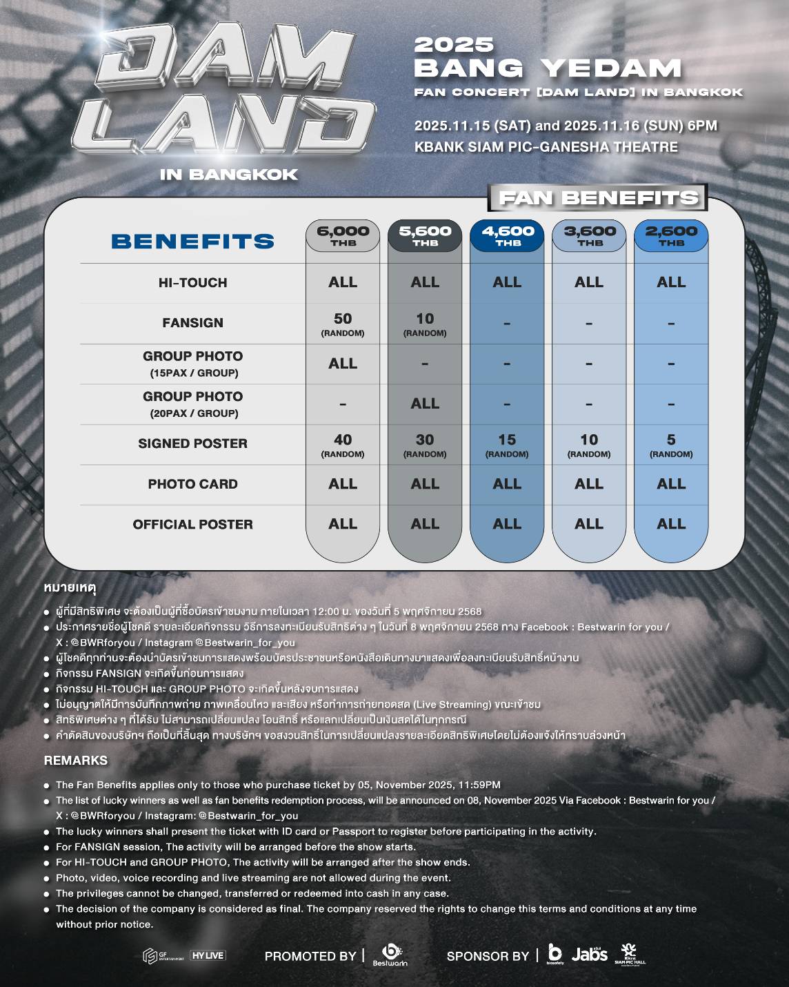 )にて発売開始。価格は6,000 / 5,600 / 4,600 / 3,600 / 2,600バーツ。2日間にわたって、ここでしか見られない特別なパフォーマンスが繰り広げられる予定です。