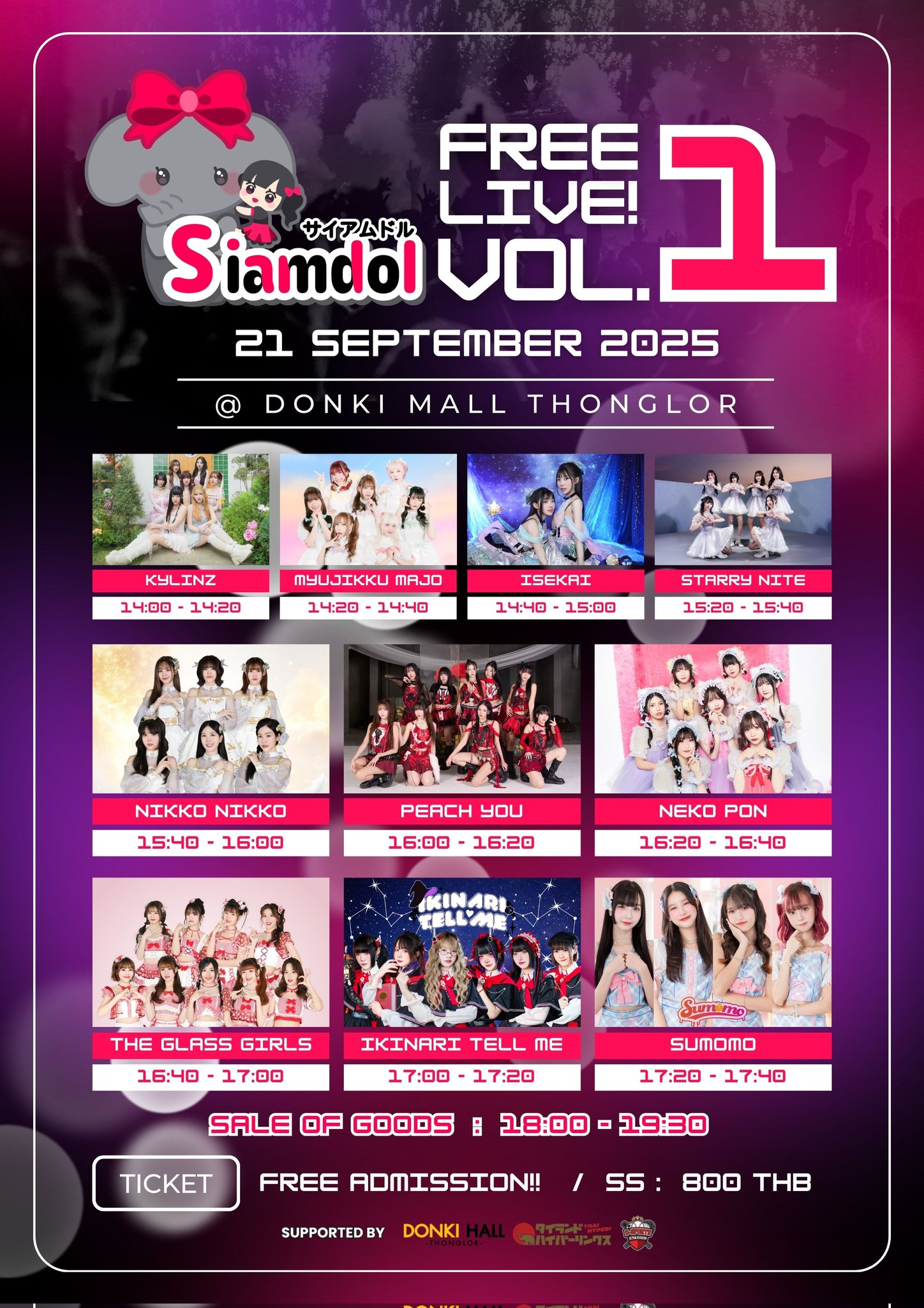 タイのアイドルプロダクション・サイアムドル主催の対バンライブイベント「Siamdol presents 『Free live Vol.1』」が、バンコクのドンキホール(ドンキモール・トンロー4階)で2025年9月21日(日)に開催されます。入場は一般無料で、最前列のSS席は800バーツとなっています。