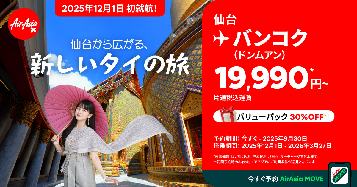 タイ・エアアジアXは2025年9月17日、バンコク(ドンムアン)〜仙台線を12月1日に新規開設すると発表しました。運航は月・水・金・日曜の週4往復。