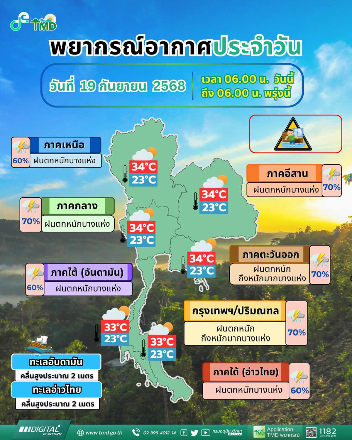 タイ気象局によると、2025年9月19日(金)はモンスーントラフが中部・東部・東北部南部を通過し、南シナ海の活発な低気圧とつながっています。さらに南西モンスーンがアンダマン海・南部・タイ湾で強まっており、全国的に雨が続く見込みです。特に バンコク首都圏と東部では非常に激しい雨 が予想され、都市型洪水や冠水、山間部の鉄砲水に警戒が必要です。