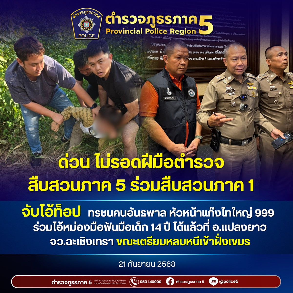 タイ警察は2025年9月21日、チェンマイで発生した14歳少女の手首切断事件の首謀格とされる通称「アイ・トップ」を、東部チャチュンサオ県プラーンヤオ郡で逮捕しました。アイ・トップはカンボジアへ越境して逃亡する準備を進めていたとみられます。
