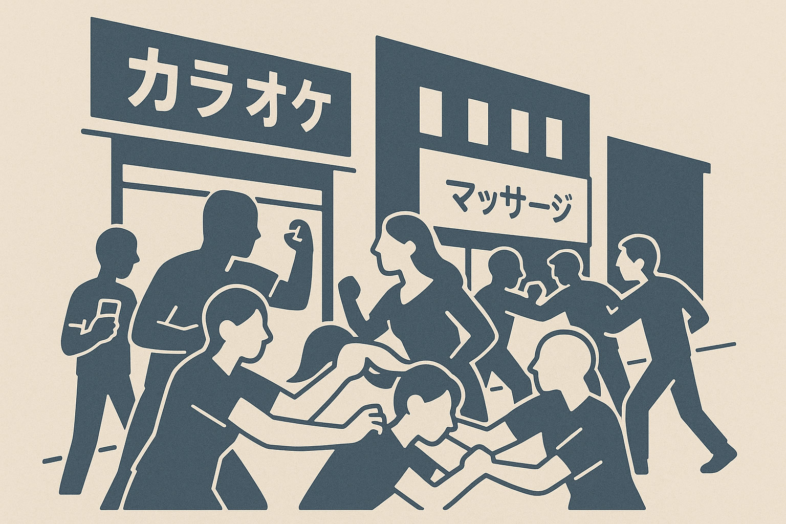 マッサージ店経営者の話によれば、きっかけは外国人客をめぐる誤解でした。事件当夜、以前に来店したことのある外国人客が店の前に車を停めたため、従業員が声をかけましたが、客は「今日はマッサージではなくカラオケ店に行く」と説明。従業員はそのまま同行して送ったところ、カラオケ店側が「客を奪われた」と誤解して口論となり、乱闘に発展したと説明しています。