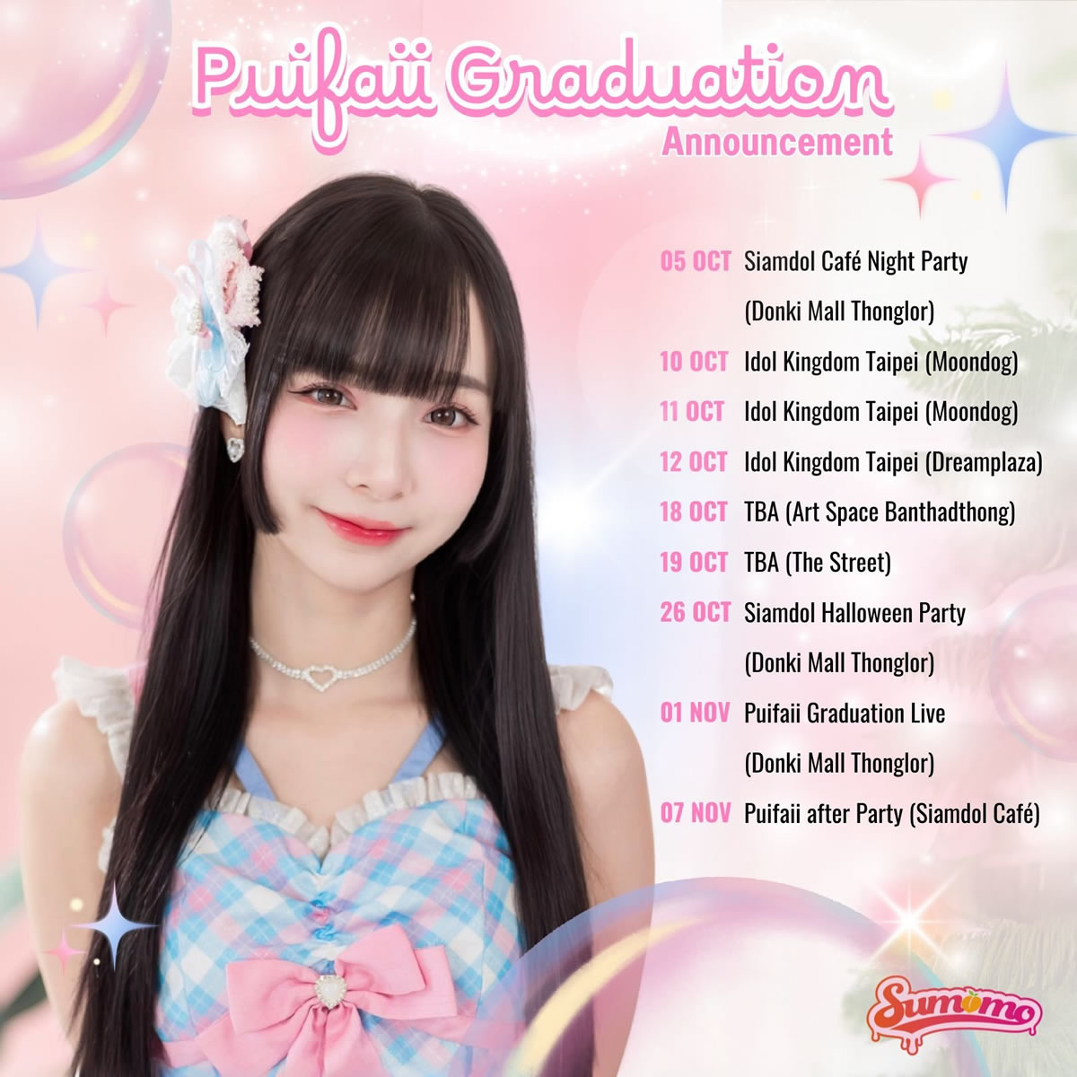 アイドルグループ Sumomoのメンバーであるプイファーイ(Puifaii)の卒業が発表されました。2025年11月1日(土)がラストライブとなり、11月7日(金)のサイアムドルカフェでのパーティーを最後にSumomoとしての活動を終えます。